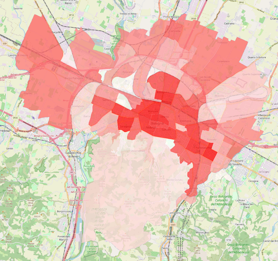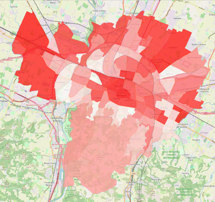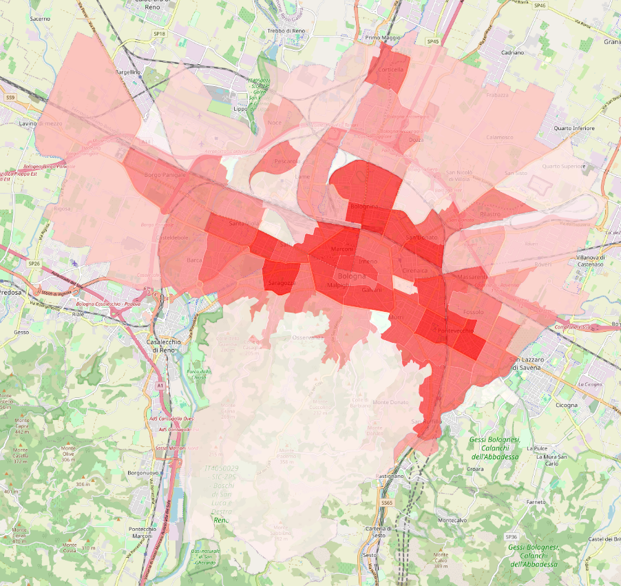 What slightly change is that the peripheral areas, completely ignored in the default representation are now targeted as possible areas due to the lack of green, like “Borgo Panigale” and “Roveri”.